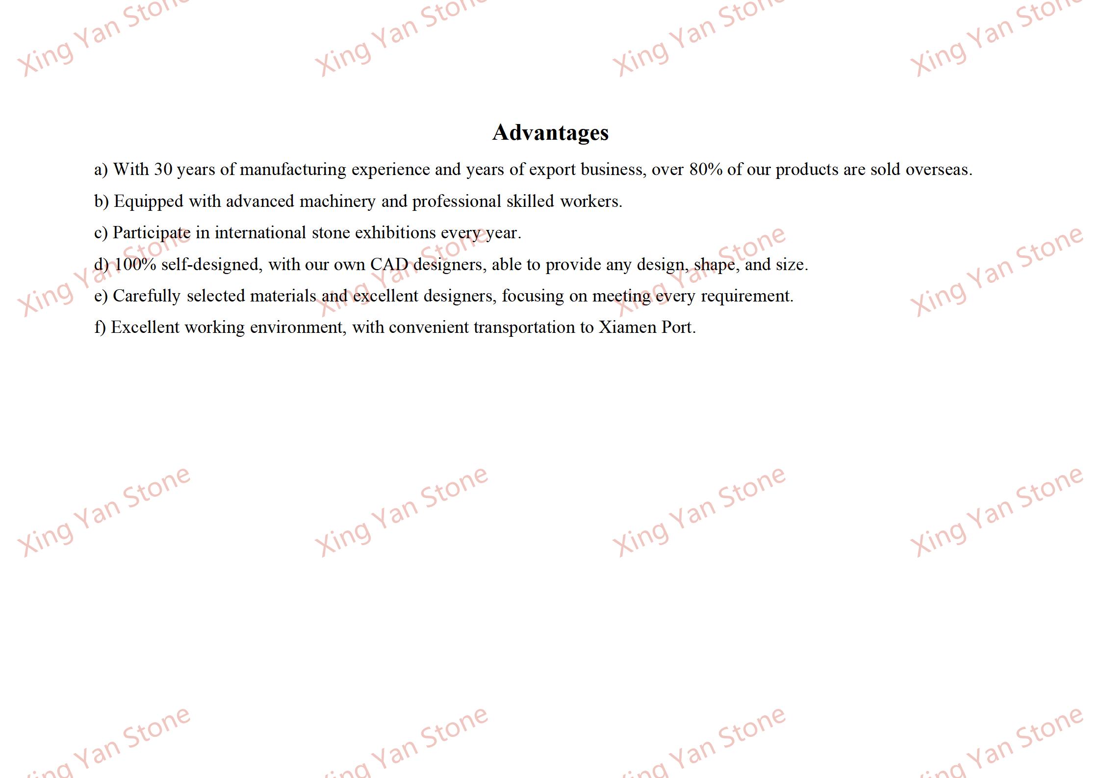 Kohandamine: standardne läbimõõt on umbes 30-80 cm (suurust, kivi värvi ja pinnatöötlust saab soovi korral kohandada). Aluse kuju ja suurust saab ka kohandada, et see vastaks erinevate stsenaariumide paigaldus- ja kuvamisvajadustele.